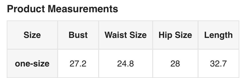 | Size | Bust (in) | Waist Size (in) | Hip Size (in) | Length (in) | Straps Length (in) |