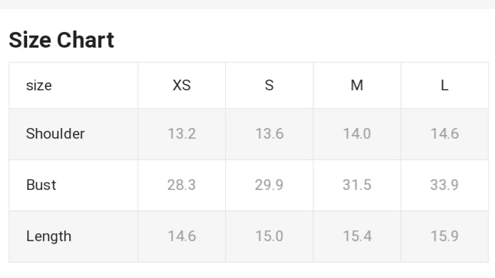 | Size | Bust (in) | Waist Size (in) | Hip Size (in) | Length (in) | Straps Length (in) |