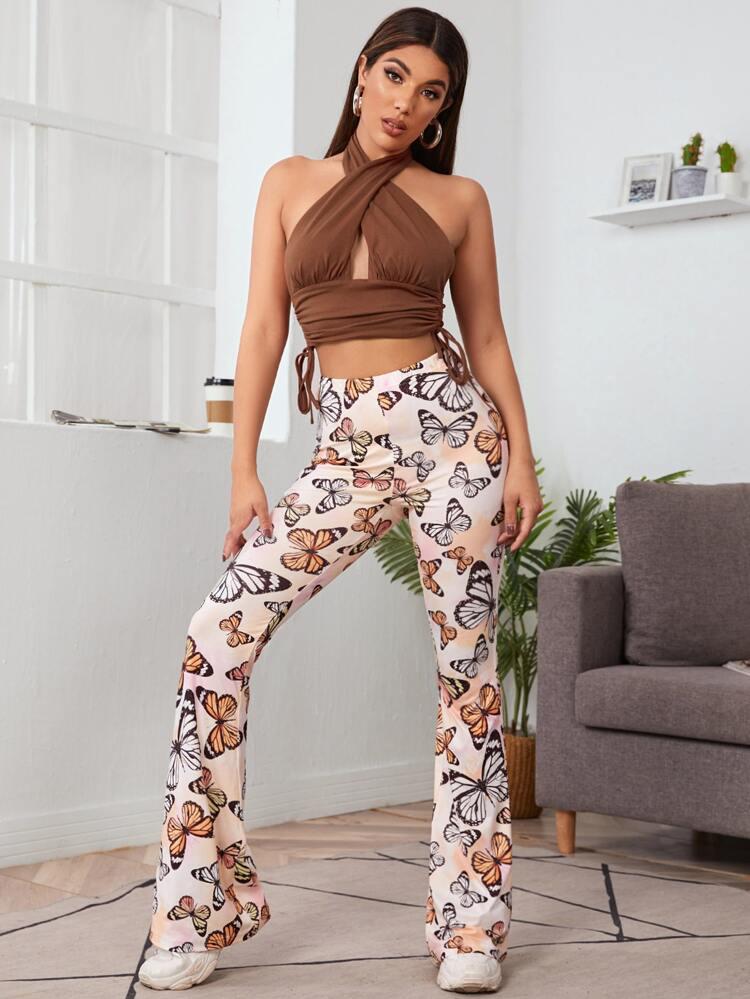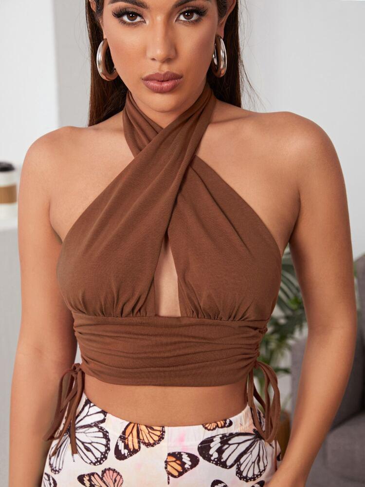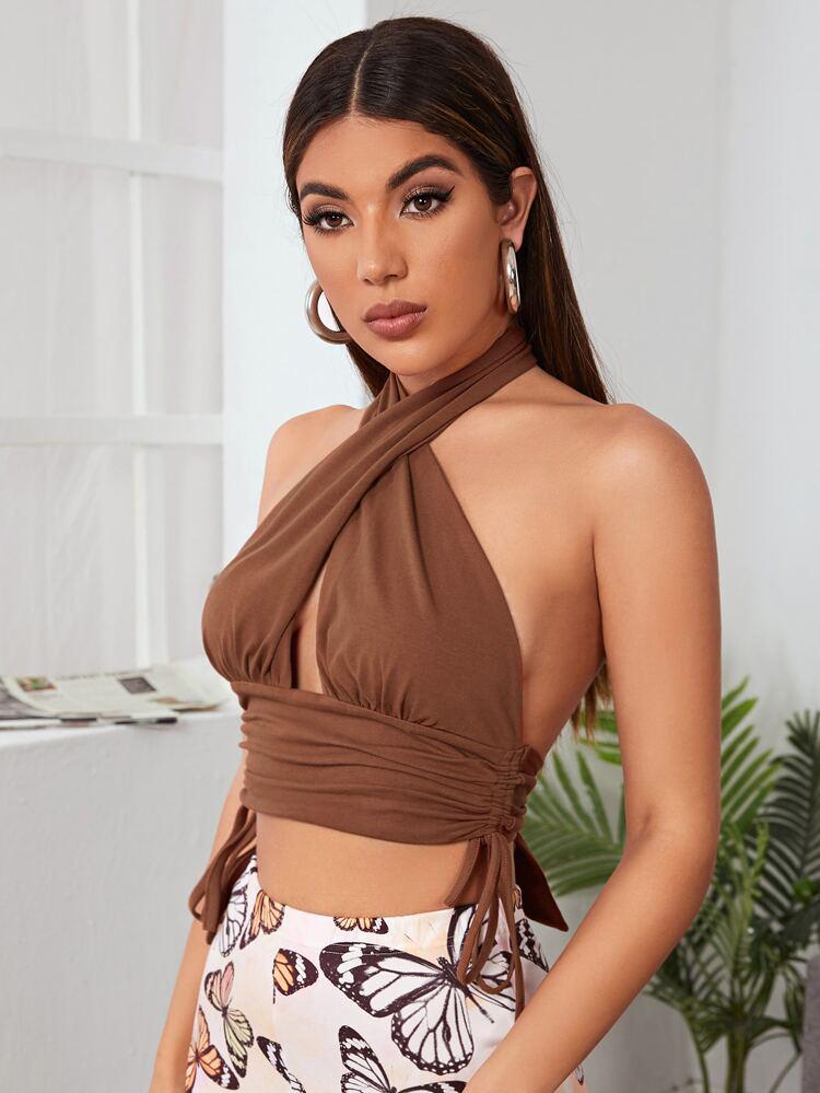 Solid Criss Cross Backless Drawstring Side Halter Top