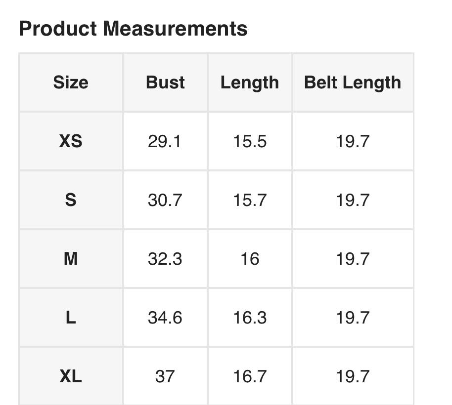 | Size | Bust (in) | Waist Size (in) | Hip Size (in) | Length (in) | Straps Length (in) |